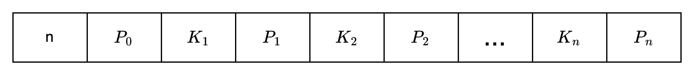 其中, $K_i$ (i=1,...,n)为关键字,且 $K_i$ < $K_{i-1}$ (i=1,...,n-1); $P_i$ (i=0,...,n)为指向子树根结点的指针,且指针 $P_{i-1}$ 所指子树中所有结点的关键字均小于 $K_i$ (i=1,...,n), $P_n$ 所指子树中所有结点的关键字均大于 $K_n$ ,n( $\lceil m/2 \rceil - 1 \leq n \leq m-1$ )为关键字的个数(或n+1为子树个数)